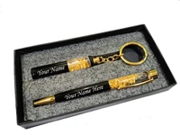 - The keychain and pen will have the name that you give. The pen would be blue ball ink Pen. Name will be engraved using laser machines which makes sure that the engraving last forever.